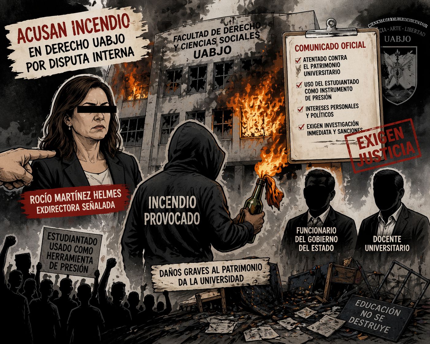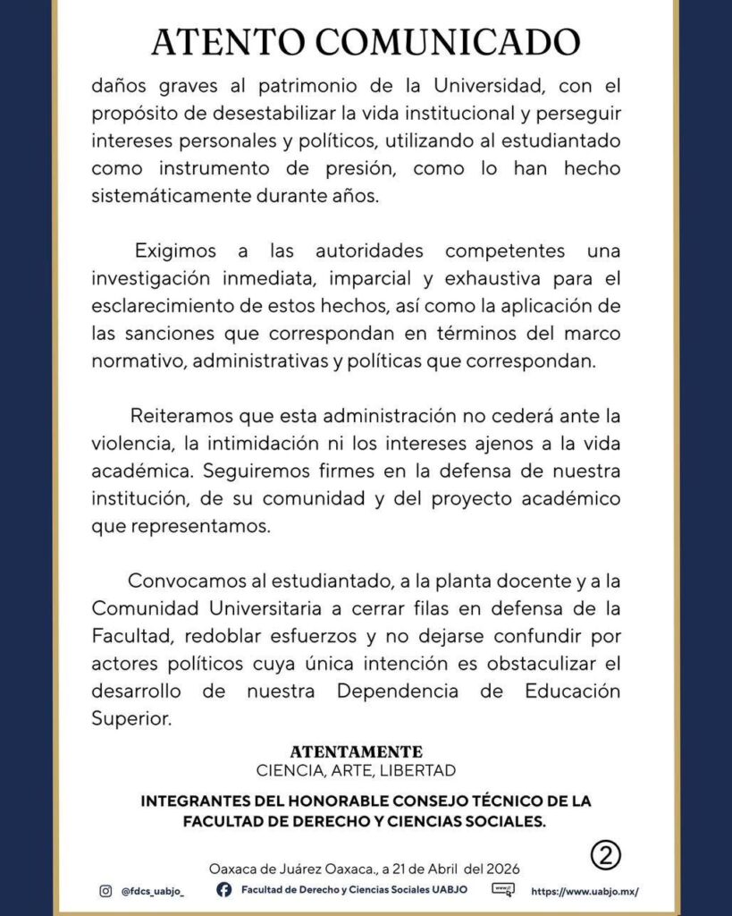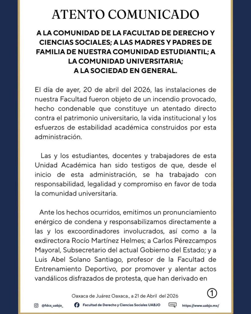 📍 Oaxaca de Juárez, Oax.- El conflicto en la Facultad de Derecho y Ciencias Sociales de la UABJO escaló tras la difusión de un comunicado oficial en el que se responsabiliza directamente a la exdirectora Rocío Martínez Helmes por el incendio registrado el 20 de abril dentro de las instalaciones universitarias.