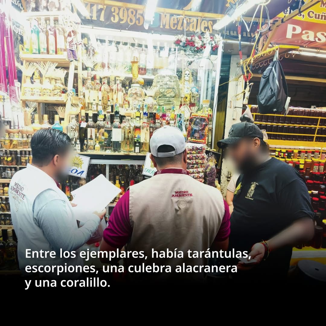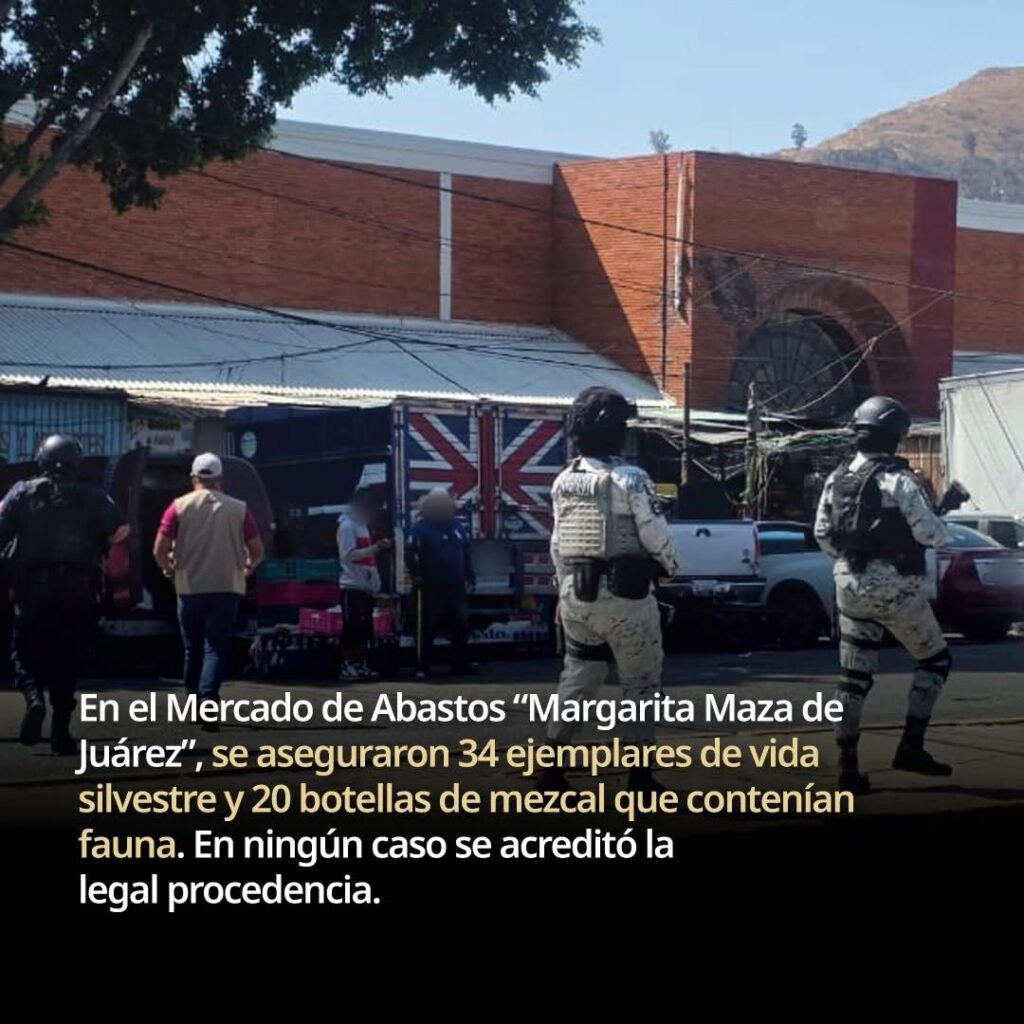 En un operativo encabezado por la Procuraduría Federal de Protección al Ambiente (Profepa), autoridades realizaron el aseguramiento precautorio de 20 botellas de mezcal que contenían fauna silvestre, así como 34 ejemplares entre tarántulas, escorpiones, una culebra alacranera y una coralillo, en el Mercado de Abastos “Margarita Maza de Juárez” de la ciudad de Oaxaca. 🚔🍶