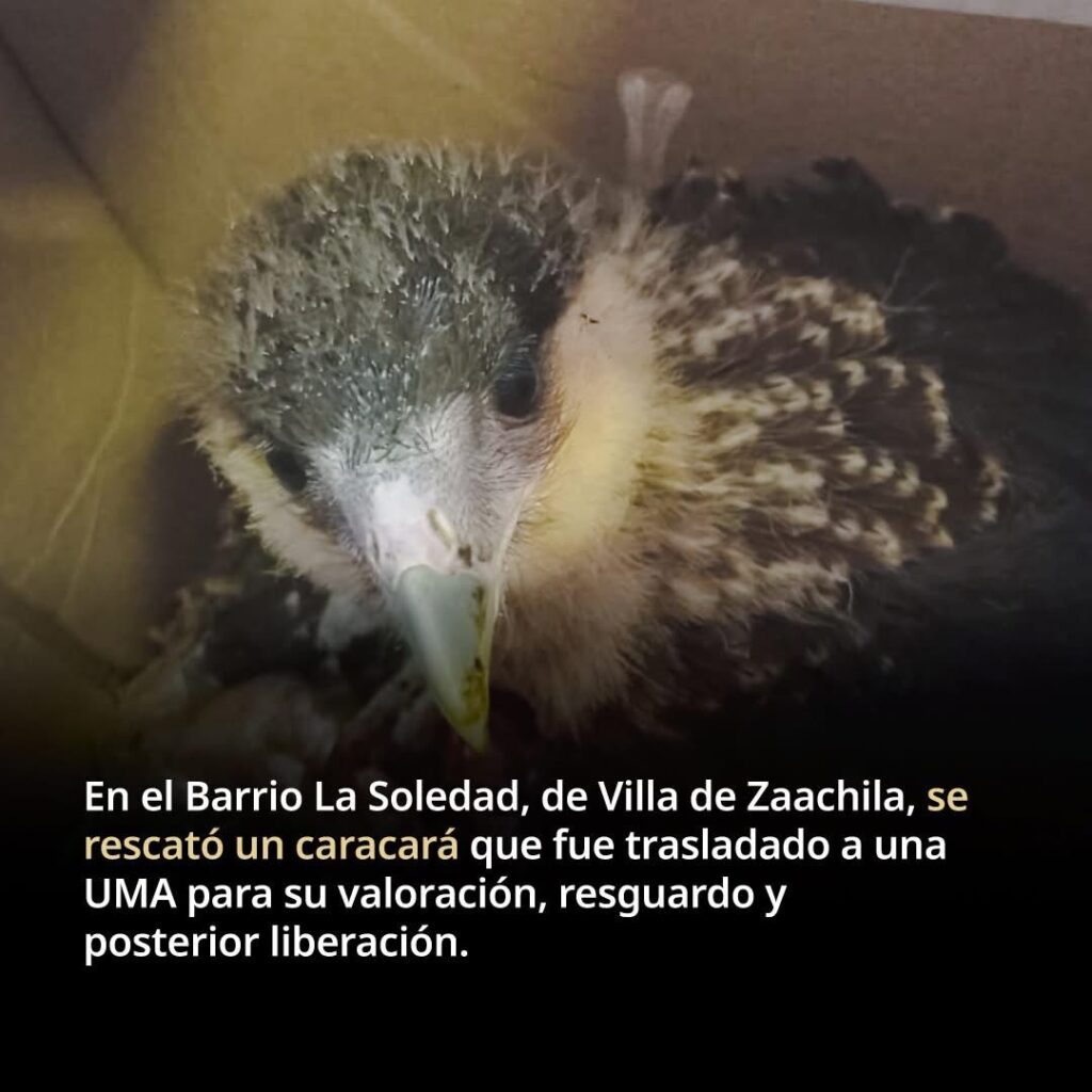 En una acción paralela, en el Barrio La Soledad de la Villa de Zaachila, se logró el rescate de un caracará (Caracara cheriway) 🦅, el cual fue trasladado a una Unidad de Manejo Ambiental (UMA) para su valoración médica, resguardo y posterior liberación en su hábitat natural.