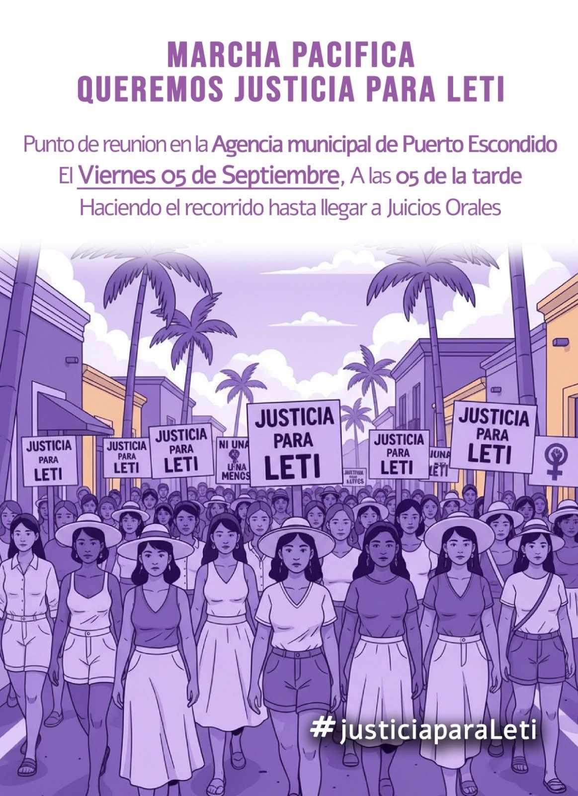 La convocatoria, difundida en la página Justicia para Leti, señala que la movilización se llevará a cabo el viernes 5 de septiembre a las 17:00 horas, partiendo desde la explanada de la agencia municipal de Puerto Escondido hacia los juzgados de juicios orales.
