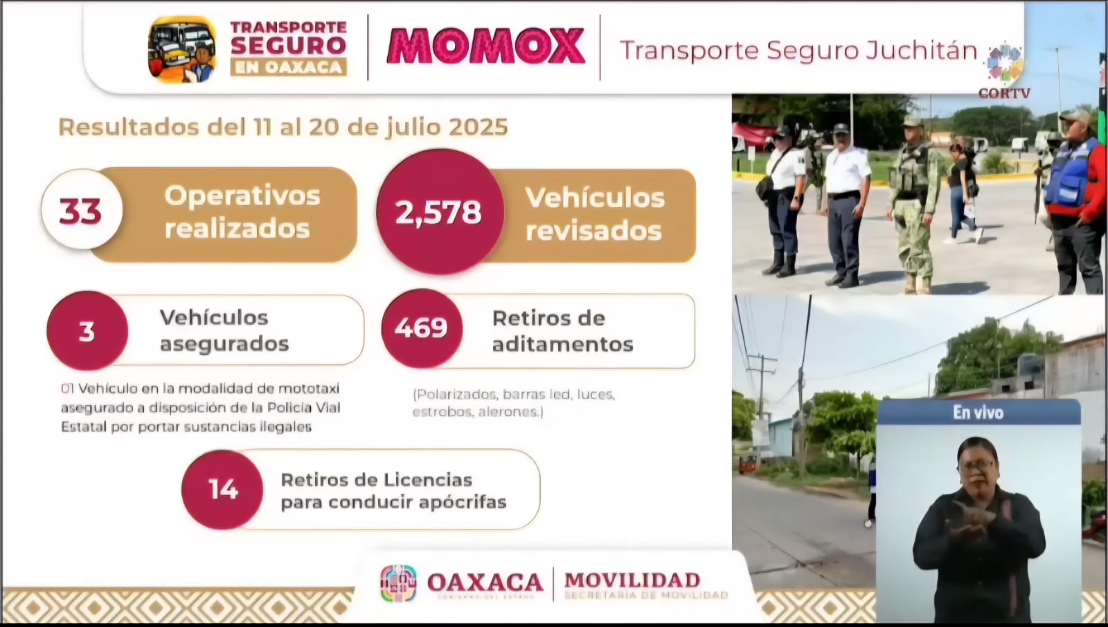 Como parte del operativo “Momox”, iniciado recientemente en la región del Istmo, autoridades han realizado 33 intervenciones, revisando 2,578 vehículos. Producto de estas acciones, se aseguraron tres unidades, una de ellas por portar sustancias ilegales, y se decomisaron 469 aditamentos prohibidos como vidrios polarizados, barras led, estrobos y alerones. Además, se detectaron 14 licencias apócrifas.