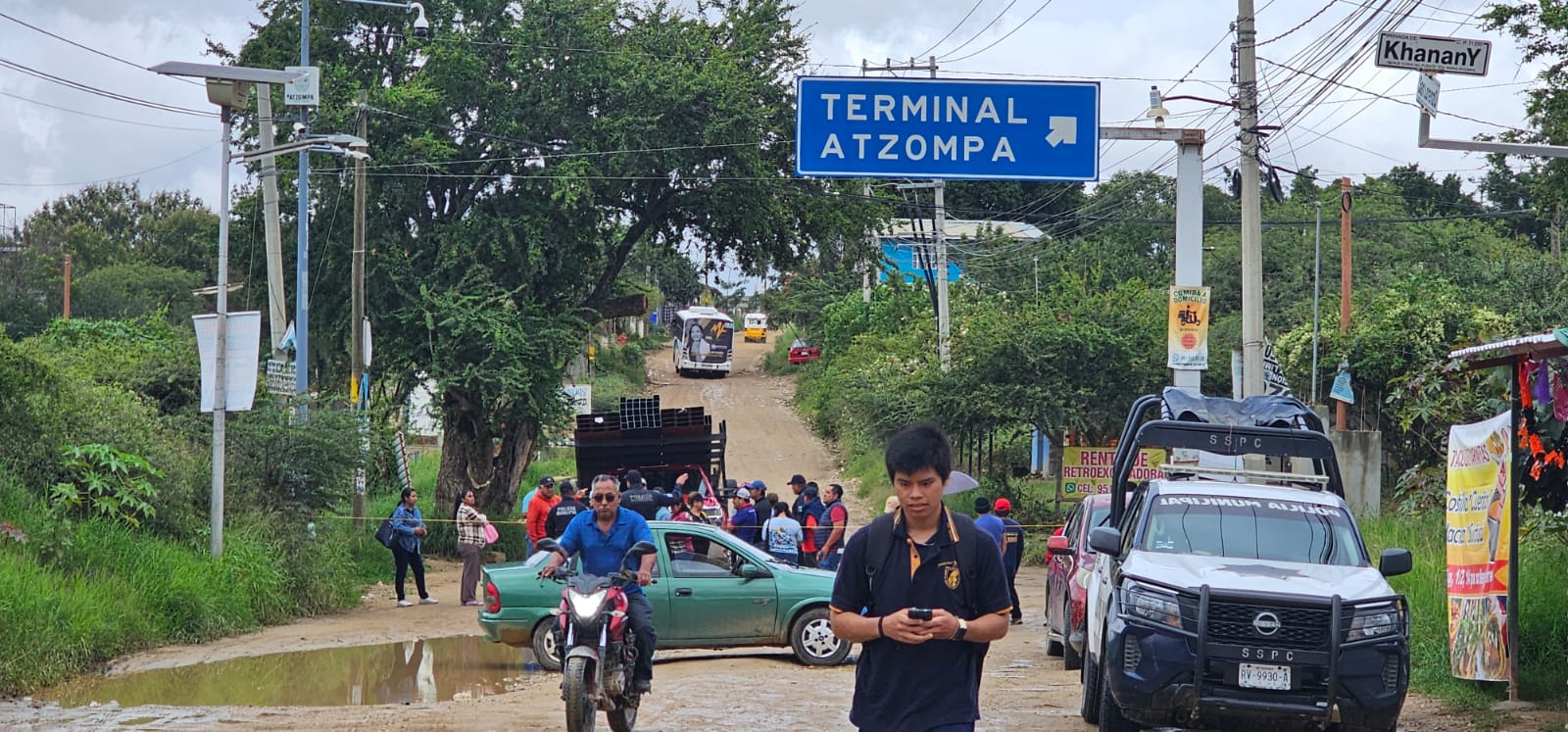 Habitantes de los fraccionamientos Residencial Santa María, Alfareros y Las Lomas mantienen bloqueado desde esta mañana el camino que conduce a estas zonas habitacionales en Santa María Atzompa, a la altura del puente ubicado en el punto conocido como El Guamúchil.