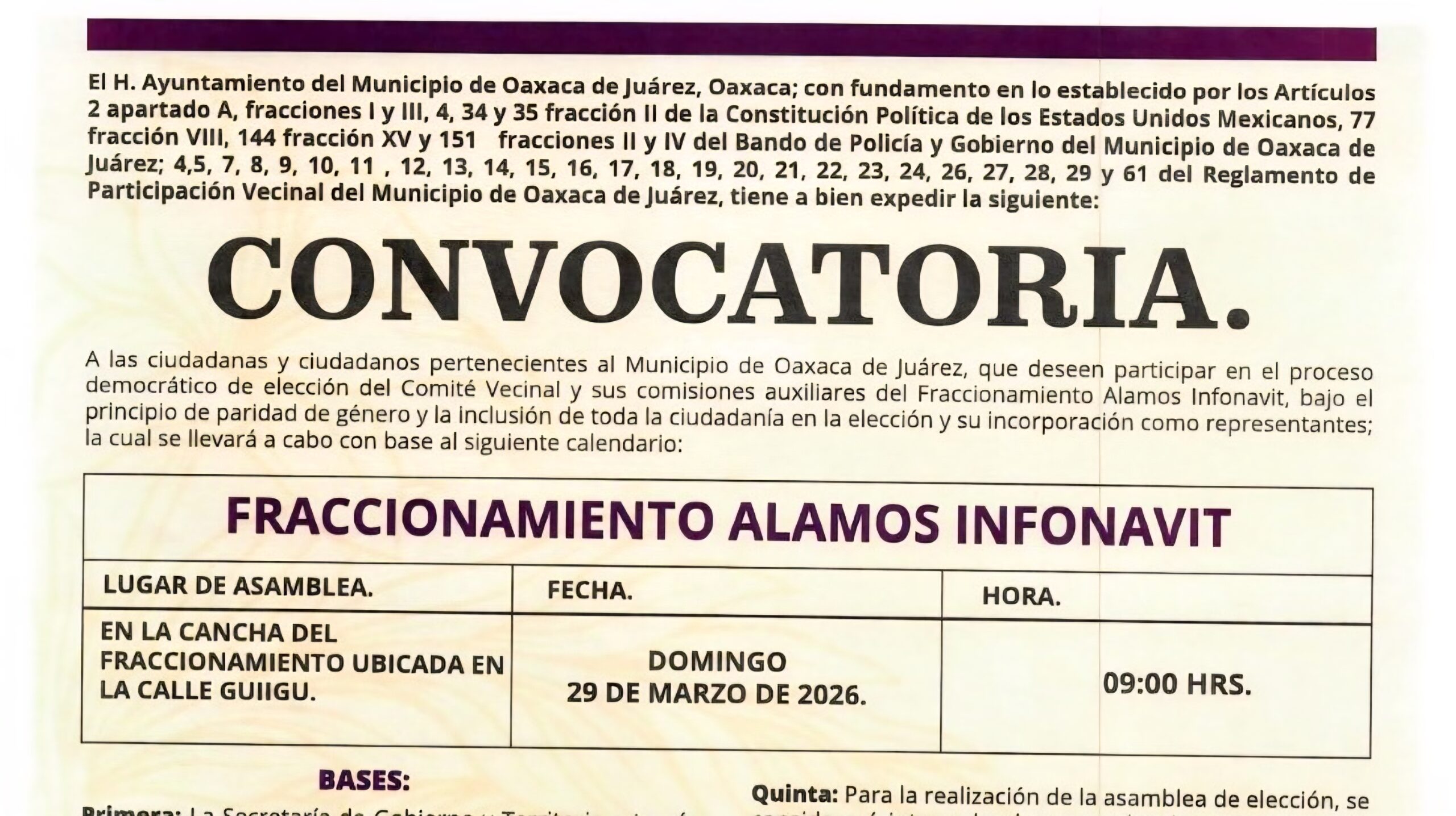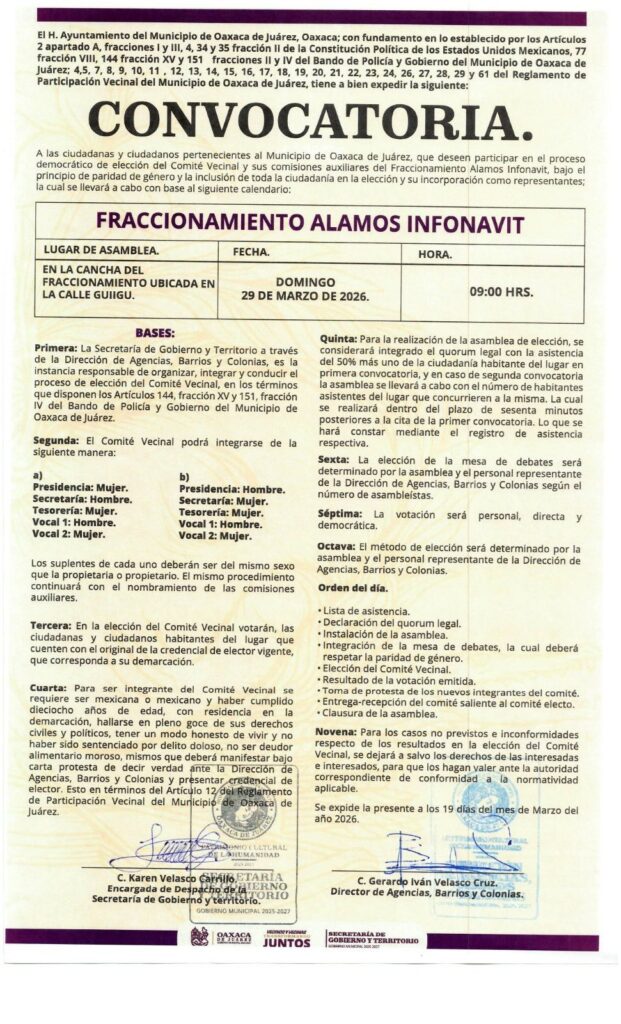 Como parte de las acciones para fortalecer el tejido social y promover una ciudadanía más participativa, la Secretaría de Gobierno y Territorio del Municipio de Oaxaca de Juárez, a través de la Dirección de Barrios y Colonias, puso en marcha una nueva etapa de renovación de Comités Vecinales y Comisiones Auxiliares en el Fraccionamiento Álamos Infonavit y el Fraccionamiento Álamos IVO.