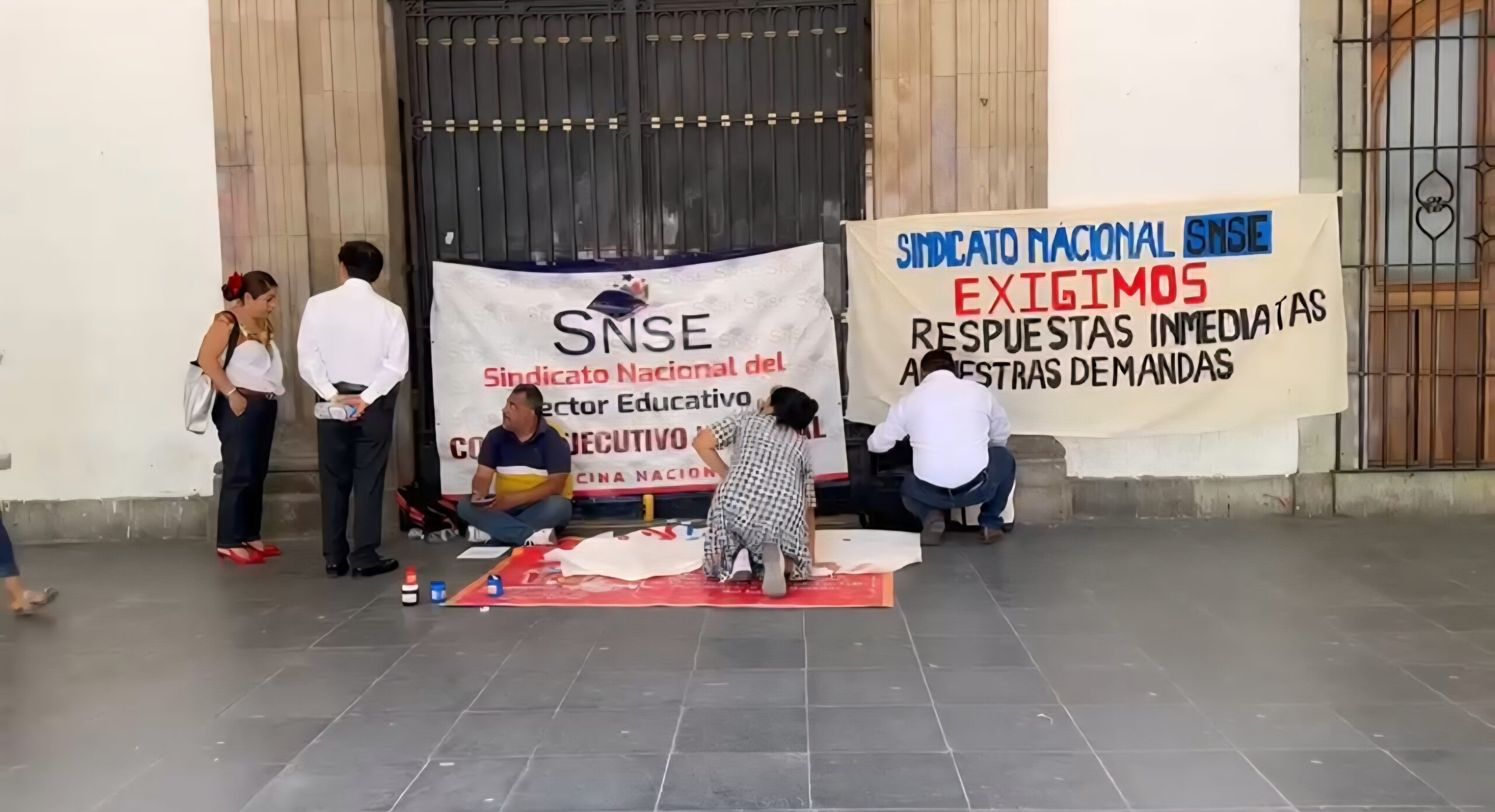 Integrantes del Sindicato Nacional del Sector Educativo (SNSE), protestan en los accesos del Palacio de Gobierno.