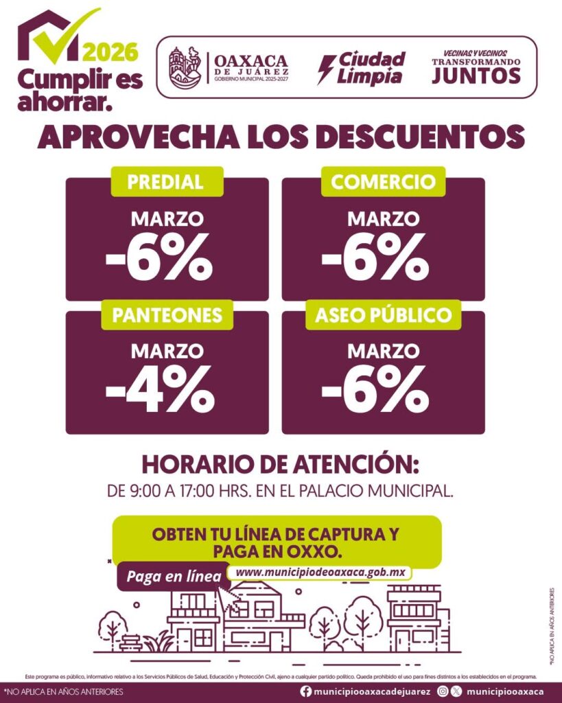 Oaxaca de Juárez, Oax., 20 de marzo de 2026.- El Municipio de Oaxaca de Juárez informa a vecinas y vecinos que durante el mes de marzo continúa vigente el 6% de descuento en el pago del impuesto predial, como parte del programa “Cumplir es ahorrar 2026”.