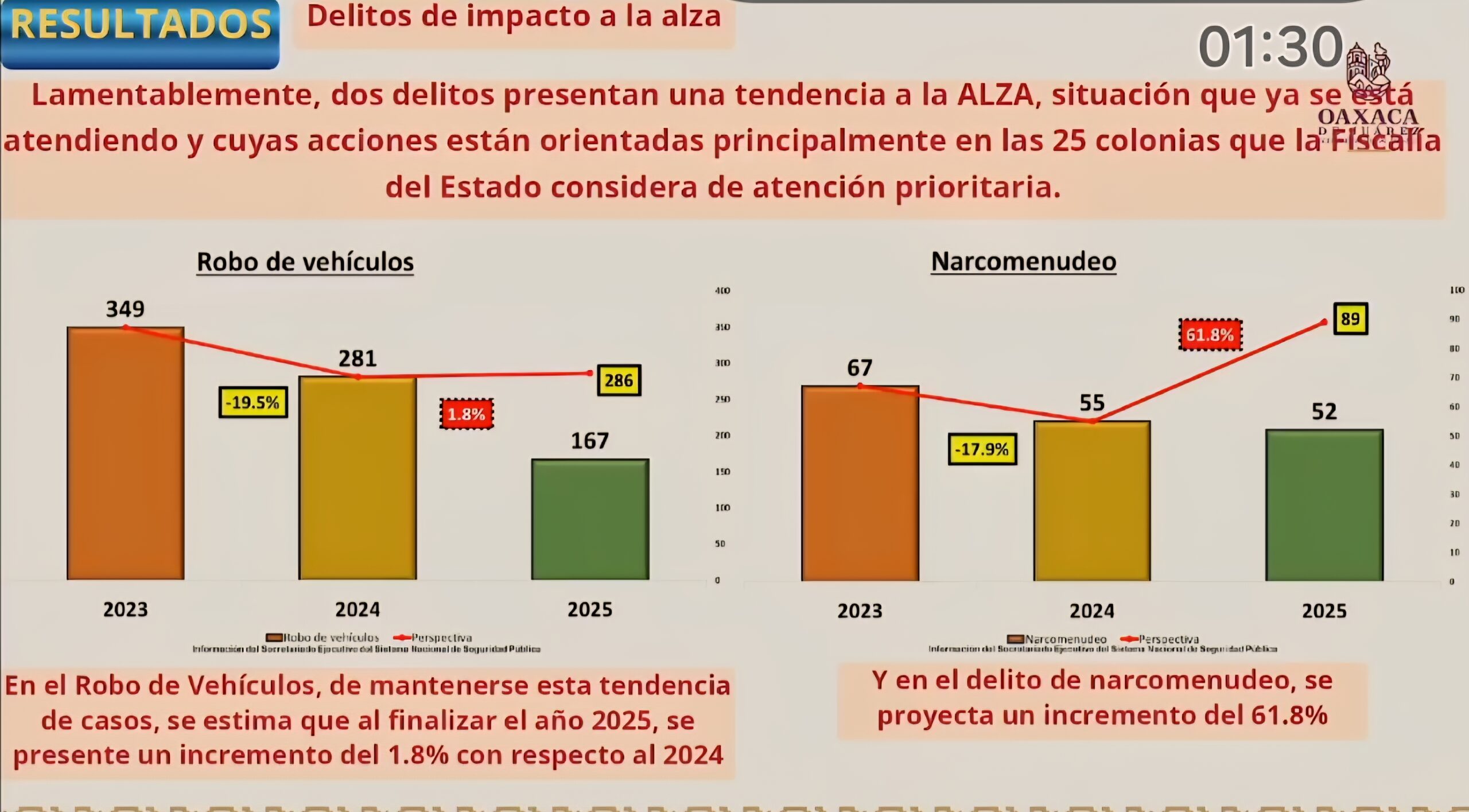El secretario de Seguridad Vecinal, Claudio de Jesús Pérez y Pérez, informó que delitos como la extorsión (-43.7%), el robo a transeúnte (-70.8%) y la violencia familiar (-31.7%) han presentado una notable reducción en lo que va del año. Sin embargo, el narcomenudeo creció un 61.8%, lo que lo coloca como la principal preocupación de las autoridades en la capital.