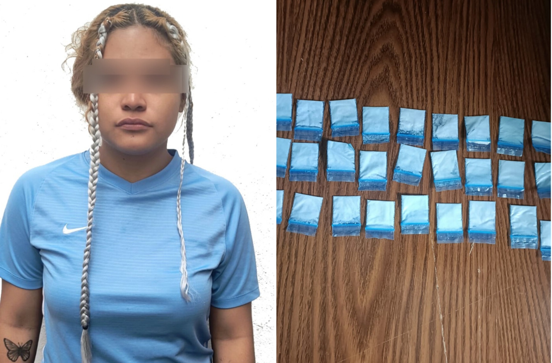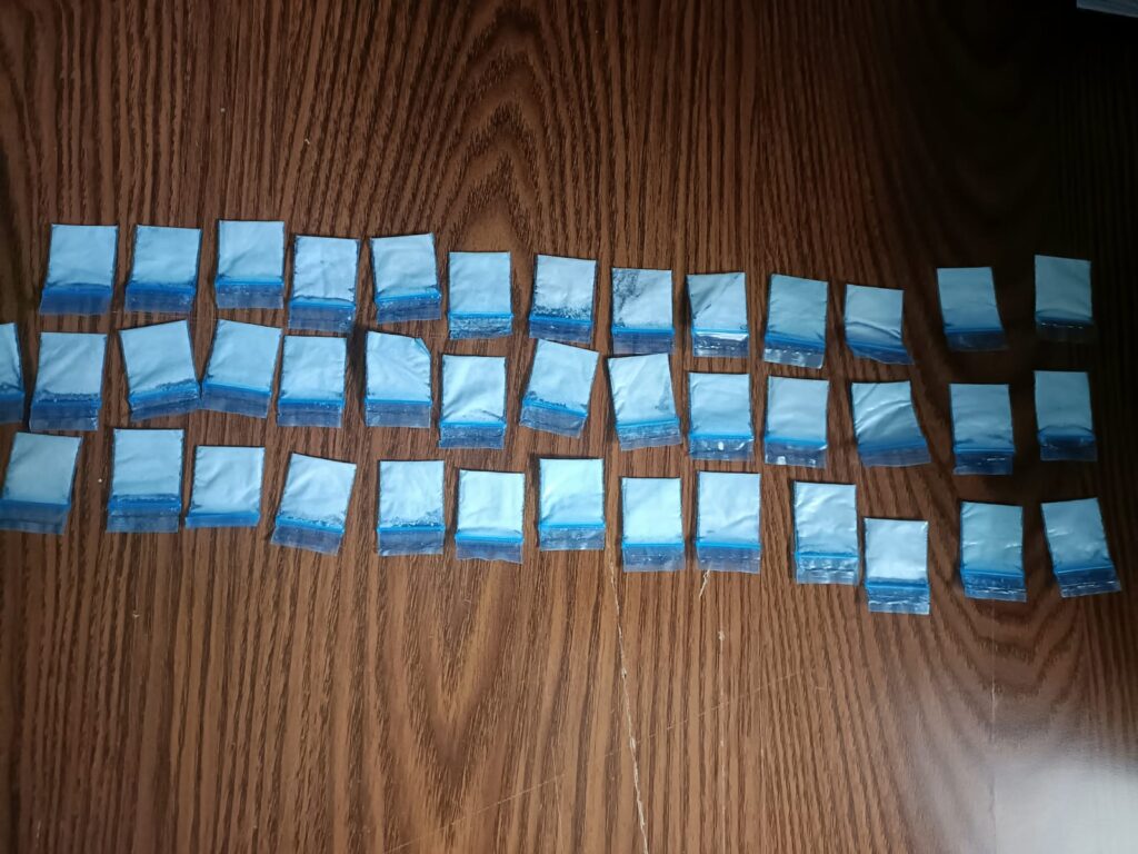 Durante la verificación del número de serie de la motocicleta Yamaha MT150, el masculino mostró una actitud evasiva e intentó ocultar un objeto en la cintura. Ante ello, se le practicó una inspección precautoria, encontrando debajo del pantalón una bolsa de plástico con varias dosis en bolsitas tipo ziploc que contenían una sustancia granulada color blanco, con características similares a la droga conocida como cristal.