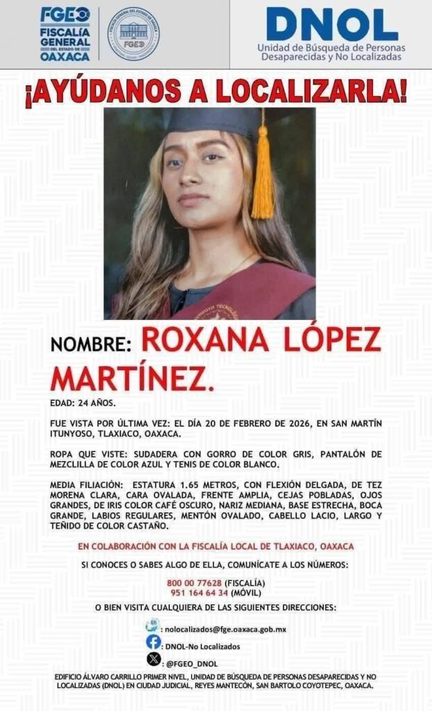 Han pasado 40 días desde que Roxana López Martínez, joven ingeniera agrónoma de origen triqui, fue vista por última vez en San Martín Itunyoso… y lo más alarmante no es solo su ausencia, sino el vacío de acción de quienes deberían buscarla.