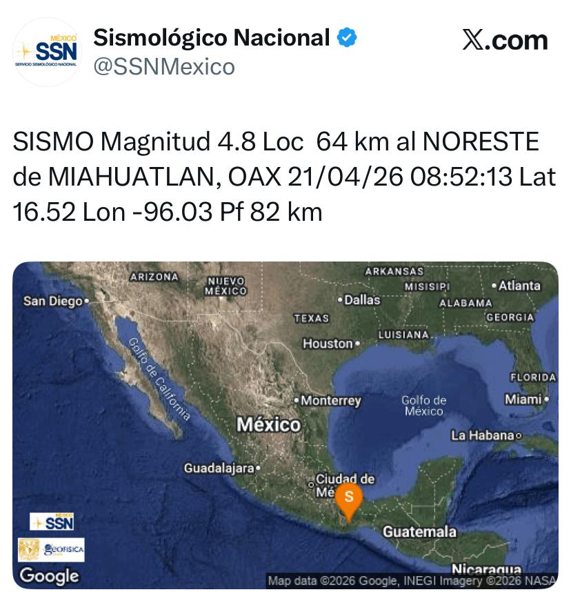 De acuerdo el Sismológico Nacional, de manera preliminar el Sismo fue de magnitud 5.2 a 57 kilómetros al Sureste de Tlacolula de Matamoros.