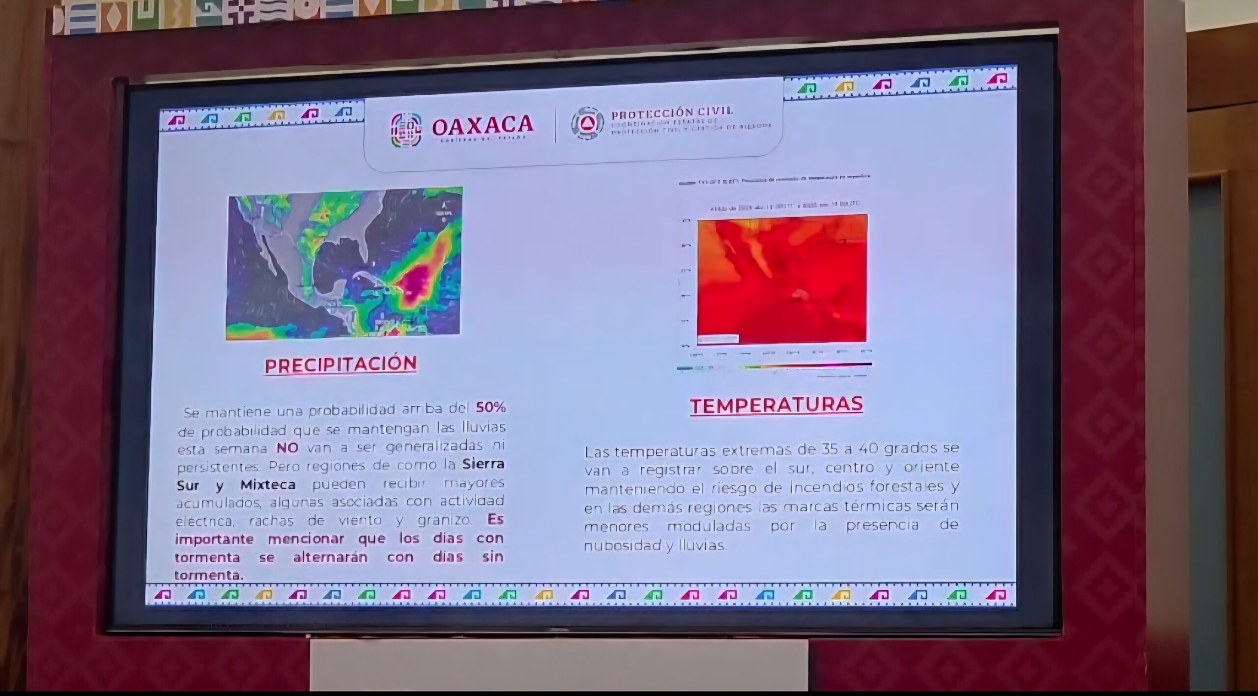 Se prevé una alta probabilidad de lluvias, superior al 70%, con precipitaciones persistentes principalmente en la Sierra Sur y la Mixteca, donde podrían registrarse los mayores acumulados. Estas lluvias estarán acompañadas de tormentas eléctricas, rachas de viento y posible caída de granizo, condiciones similares a las registradas la semana pasada.